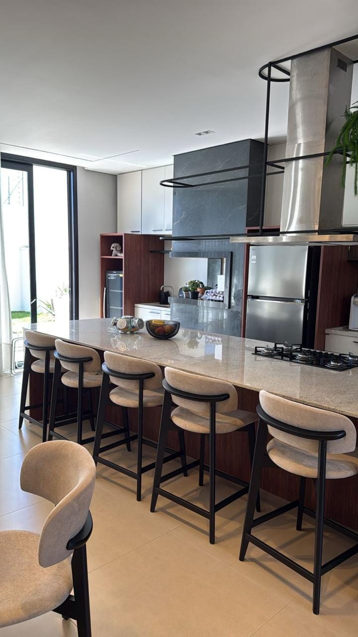 área externa que possui um amplo espaço com deck e piscina. Possui ainda, 03 suítes sendo 01 master, living integrado para diversos e amplos ambientes, cozinha gourmet com churrasqueira,